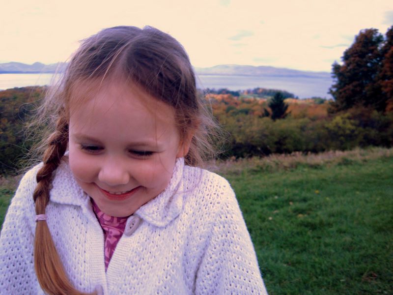 Katie and Dex, top of hill. Lake Champlain in the background.